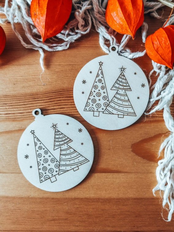Drewniana bombka z motywem świątecznym. Do samodzielnego kolorowania i dekorowania.