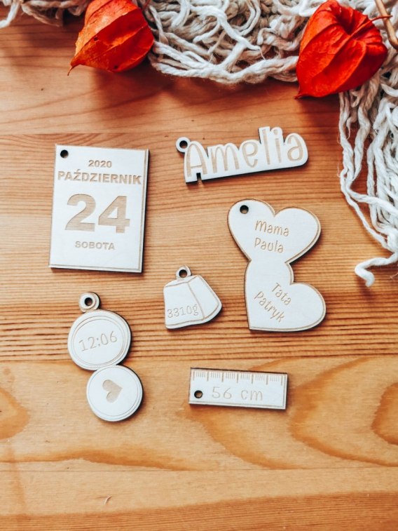Zestaw dekoracji, z którym przygotujesz wyjątkową metryczkę urodzenia dla maluszka. W opcjach personalizacji wybierzesz, czy elementy mają mieć wyciętą dziurkę na sznurek, czy nie.