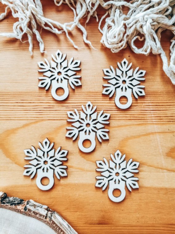 Drewniana dekoracja - gwiazdka z grubszym kółkiem, na którym możesz upleść lub zaczepić makramową choinkę. Sprawdzi się również jako baza do bombek i zawieszek choinkowych, zakładki do książki czy breloczka w klimacie świątecznym lub bajkowym.