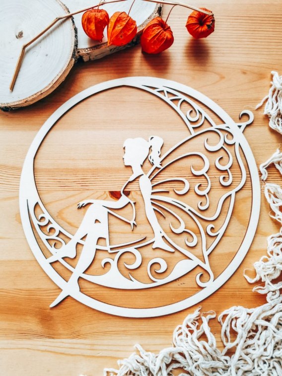 Drewniane koło z wyciętym tematycznym wzorem. Może zostać wykorzystane jako samodzielna dekoracja na ścianę lub element większej kompozycji. Świetnie sprawdzi się także przy tworzeniu stylowych makram, makatek łapaczy snów lub wianków.