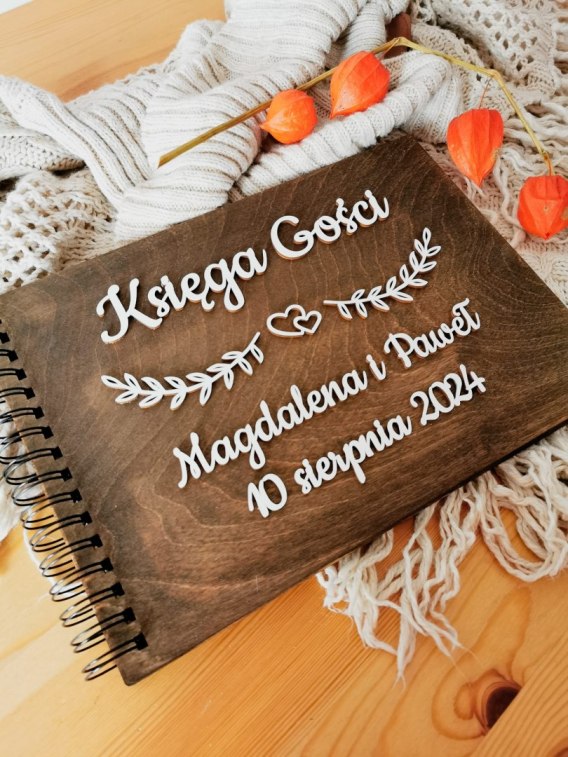Księga Gości Ślubnych z drewnianą okładką oraz napisem 3d. Okładka jest dowolnie personalizowana. W odpowiednim polu wpisz Wasze imiona i datę (dokładnie tak jak mamy je nanieść - nie dokonujemy korekty personalizacji).