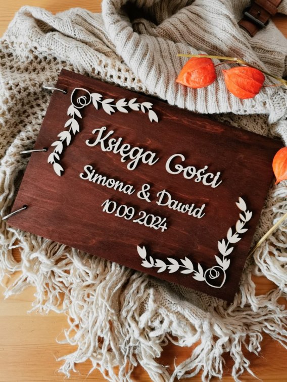 Księga Gości Ślubnych z drewnianą okładką oraz napisem 3d. Okładka jest dowolnie personalizowana. W odpowiednim polu wpisz Wasze imiona i datę (dokładnie tak jak mamy je nanieść - nie dokonujemy korekty personalizacji).