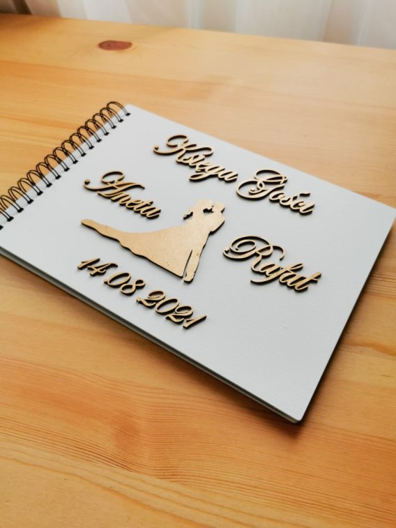 Księga Gości Ślubnych z drewnianą okładką oraz napisem 3d. Okładka jest dowolnie personalizowana. W odpowiednim polu wpisz Wasze imiona i datę (dokładnie tak jak mamy je nanieść - nie dokonujemy korekty personalizacji).