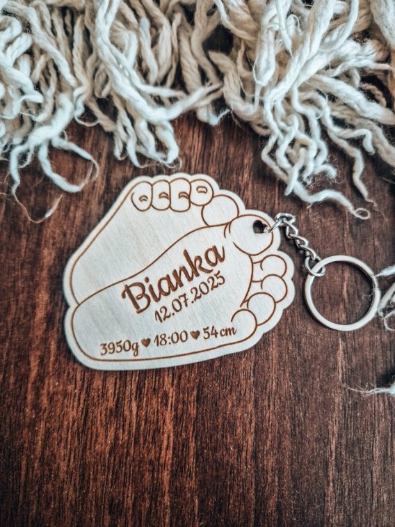 Breloczek pamiątkowy z wygrawerowaną metryczką urodzenia dziecka. Pamiątka narodzin.