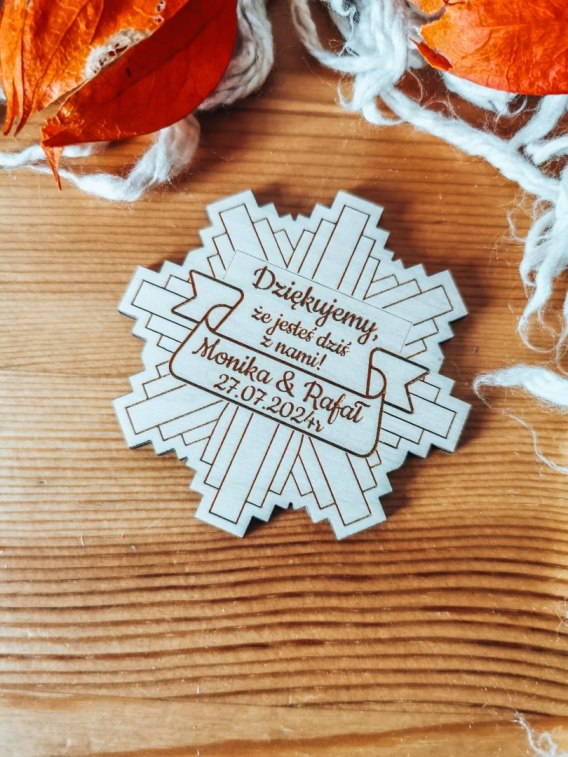 Drewniany magnes - podziękowanie dla Twoich Gości weselnych za obecność podczas Waszego Wielkiego Dnia. Pięknie wkomponuje się zwłaszcza w przyjęcia w klimacie rustykalnym czy boho.