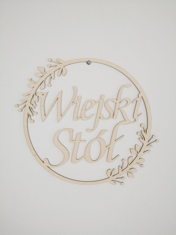Drewniana obręcz z wyciętym tekstem. Może zostać wykorzystana jako samodzielna dekoracja na ścianę lub element większej kompozycji. Świetnie sprawdzi się przy dekorowaniu i wyróżnianiu ważnych miejsc na sali weselnej - Wiejskiego Stołu, Słodkiego Stołu, itp.