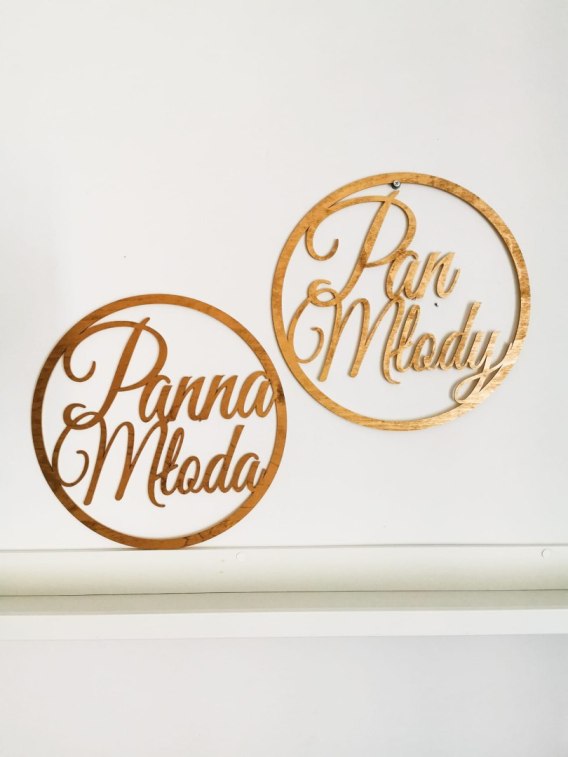 Drewniana obręcz z wyciętym tekstem. Może zostać wykorzystana jako samodzielna dekoracja na ścianę lub element większej kompozycji. Świetnie sprawdzi się zwłaszcza przy tworzeniu ścianki ślubnej za stołem Pary Młodej. Może też służyć do dekoracji krzeseł czy stołu Pary Młodej.