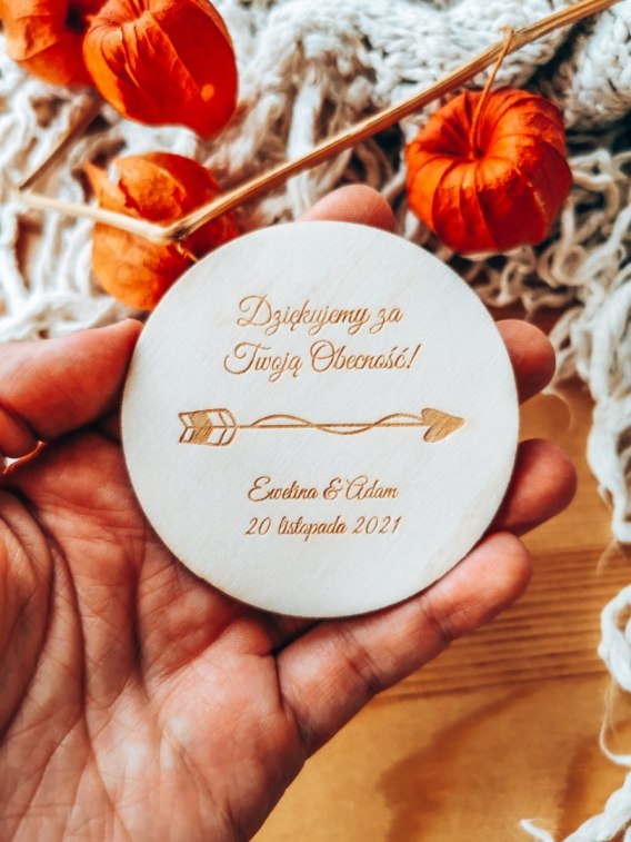 Drewniany magnes - podziękowanie dla Twoich Gości weselnych za obecność podczas Waszego Wielkiego Dnia. Pięknie wkomponuje się zwłaszcza w przyjęcia w klimacie rustykalnym czy boho.