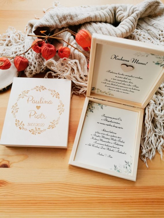 Prośba o Błogosławieństwo dla Rodziców Pary Młodej zamknięta w drewnianym pudełęczku. Będzie to wyjątkowe zaproszenie, które pozostanie pamiątką na długie lata. Wewnątrz możesz skorzystać z przykładowego tekstu lub przesłać własną treść.