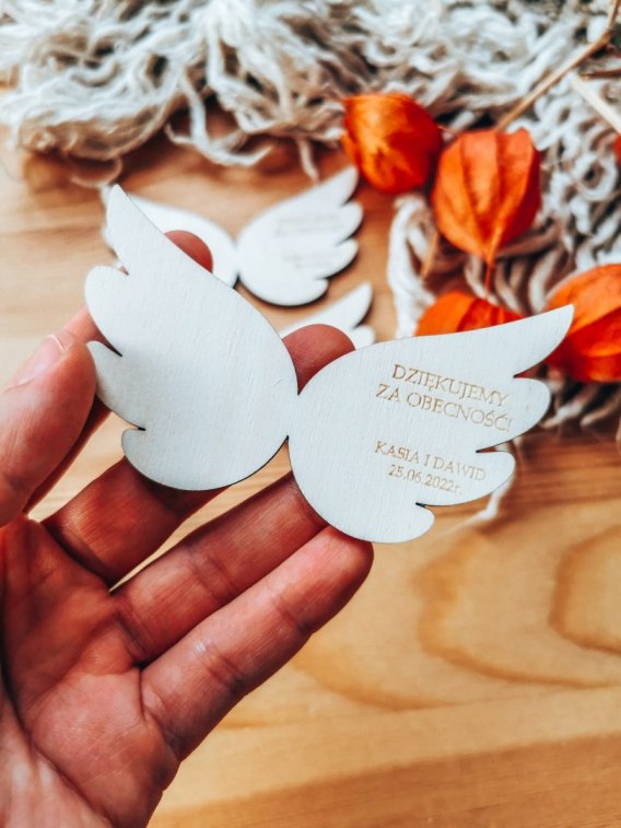Tutaj skrzydełka zaprojektowane z myślą o stworzeniu wyjątkowych podziękowań dla gości weselnych - aniołkowych magnesów lub zawieszek. Wybór magnesu zaznaczysz w opcjach personalizacji - cena zmieni się automatycznie.