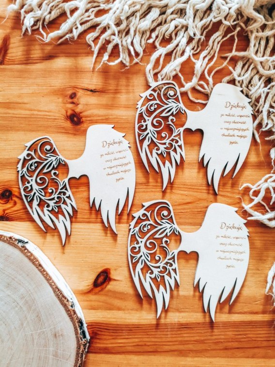 UWAGA! Na tej stronie zamówisz 3 TAKIE SAME ozdoby - skrzydła aniołka z wygrawerowaną wybraną modlitwą średnie lub duże.