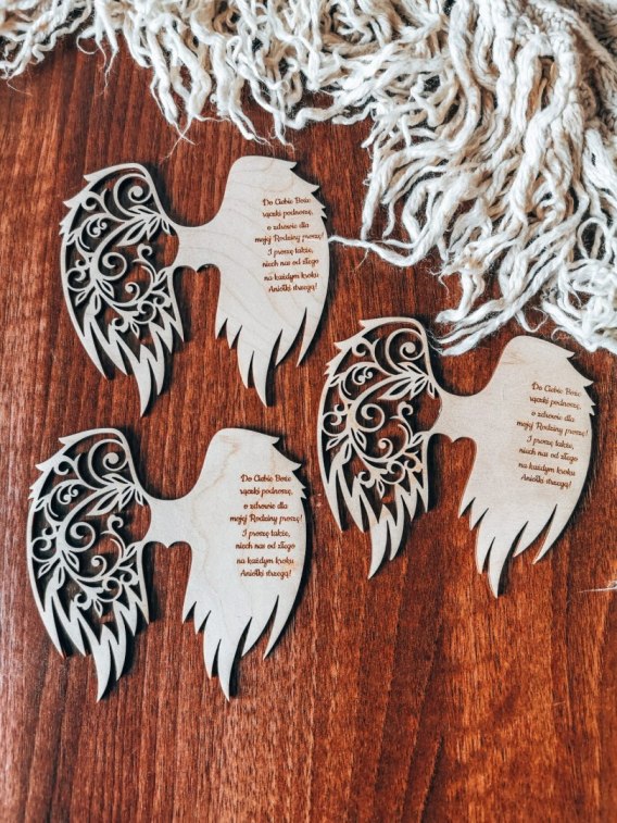 UWAGA! Na tej stronie zamówisz 3 TAKIE SAME ozdoby - skrzydła aniołka z wygrawerowaną wybraną modlitwą średnie lub duże.