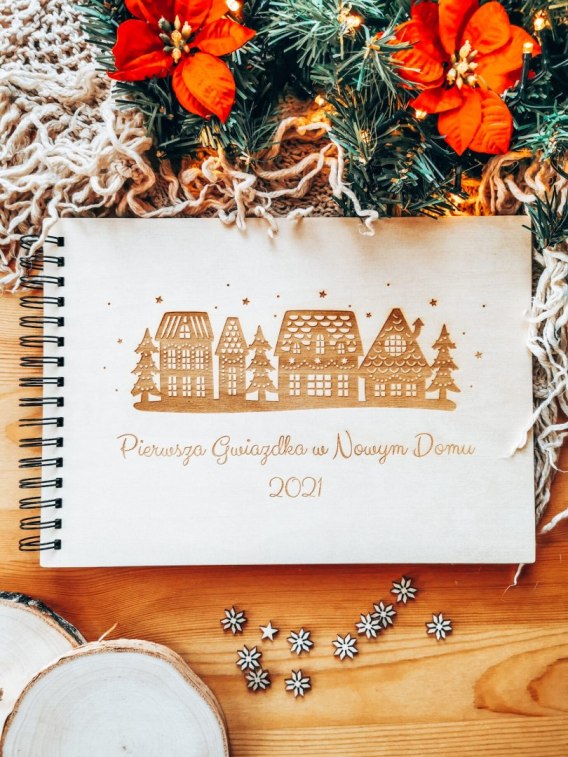 Album na zdjęcia z drewnianą okładką oraz klimatycznym, świątecznym wzorem i Twoim własnym tekstem. Będzie piękną pamiątką świąt Bożego Narodzenia. Stanie się też wyjątkowym prezentem dla Dziadków, Rodziców lub innych bliskich Wam osób. Oprócz zdjęć można w nim umieścić również życzenia, oraz gwiazdkowe rysunki czy wycinanki stworzone przez dzieci. Upamiętni też na długie lata pierwsze święta w nowym domu lub z nowym członkiem rodziny.