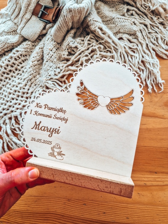 TABLICZKA STOJĄCA (1szt) - Pamiątka Komunii - serce 18cm x 18cm - - - (skrzydła dla anioła, podziękowanie, komunia)