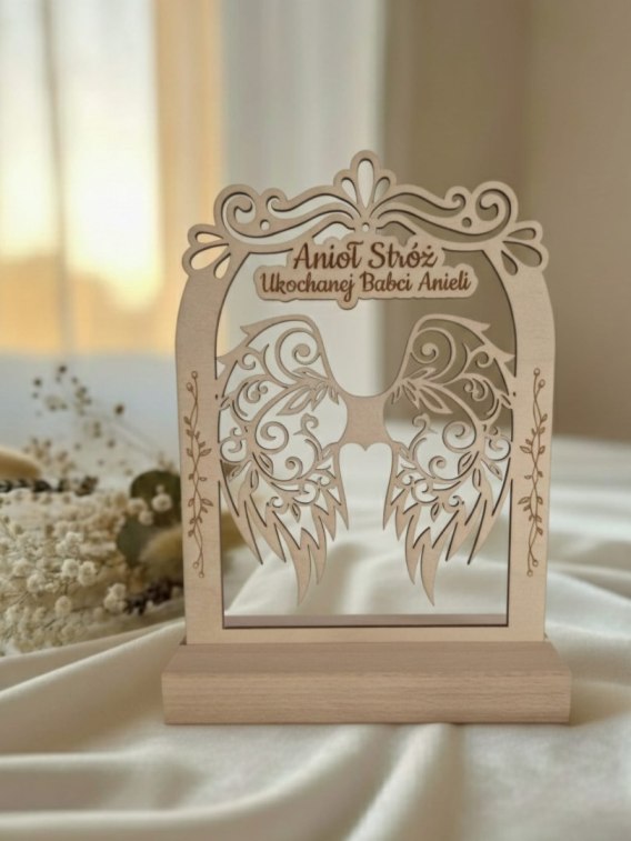 Drewniana baza - tabliczka ze skrzydełkami do aniołka. W zestawie drewniana podstawka. Z tą bazą stworzysz wyjątkowe podziękowania lub życzenia.