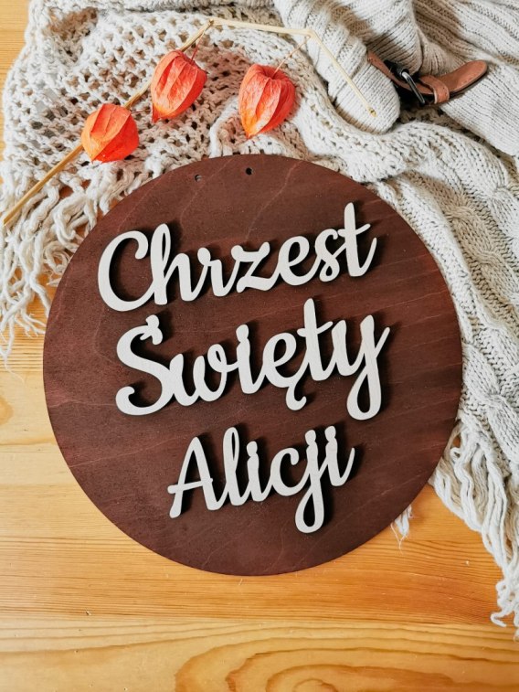 Wyjątkowa, drewniana tablica w kształcie koła z wyciętym dowolnym napisem 3d. Doskonale sprawdzi się jako samodzielna dekoracja na ścianę lub element większej kompozycji dekoracyjnej tworzonej na ważne uroczystości w życiu Dziecka oraz całej Rodziny - takie jak Chrzest, Roczek, Urodziny czy Pierwsza Komunia Święta. Doda magicznego akcentu każdej chwili uwiecznionej na zdjęciach, zarówno w prywatnych, jak i profesjonalnych sesjach zdjęciowych.
