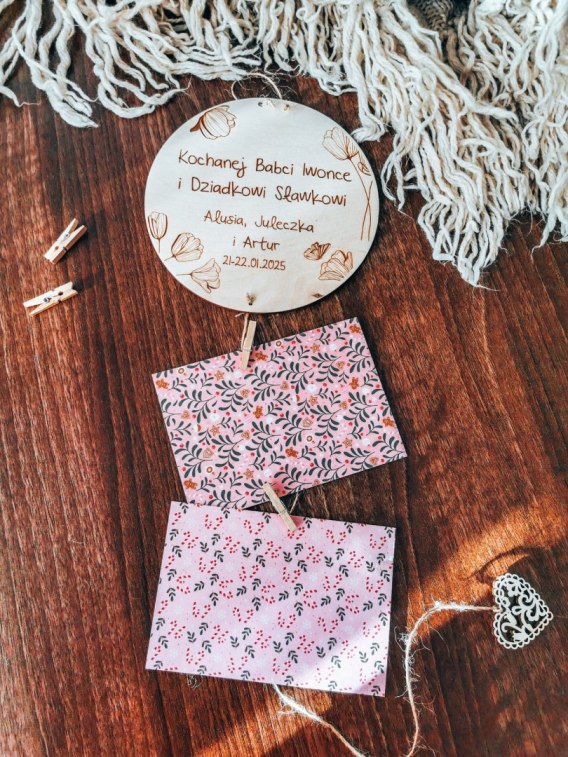 Drewniana tabliczka z personalizowaną dedykacją to piękna pamiątka z okazji Dnia Babci i Dziadka dla kochanych Dziadków. Możesz zawiesić na niej zdjęcia lub laurki.