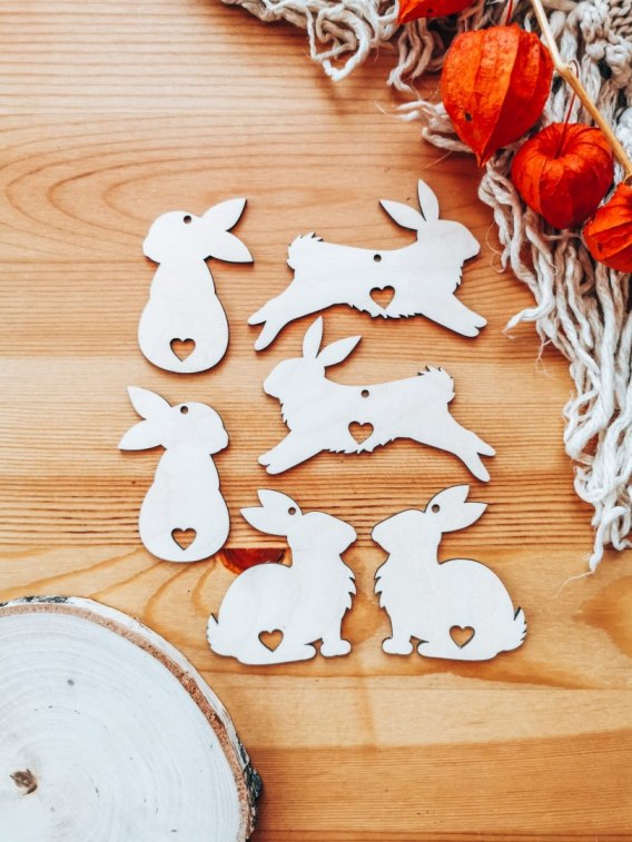 Wszystkie zajączki mają otwór na sznurek do powieszenia. Na dole natomiast zamiast dziurki na chwościk (lub inną sznurkową dekorację) zostało wycięte serduszko - dzięki temu zajączek będzie wyglądał równie pięknie również bez dodatkowych sznurkowych dekoracji.